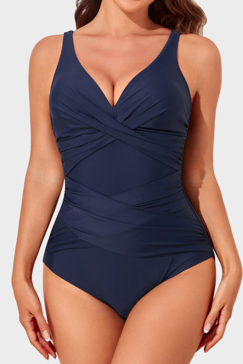 Design Features: V-Neckline, Ruched Tummy Control, Push-Up Bra with Removable Padding, Full Lining, Moderate Bottom Coverage