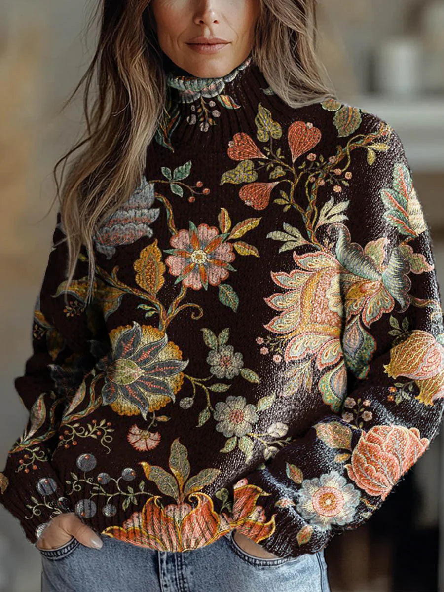 Women's Lovely Floral Art Print Knit Turtleneck Pullover Sweater