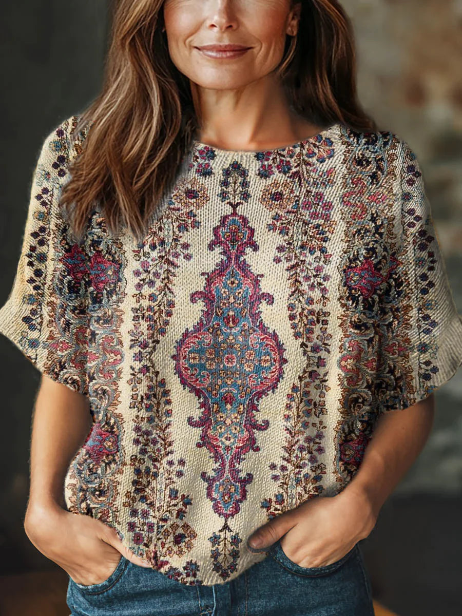 Women's Vintage Floral Art Print Casual Crew Neck Short Sleeve Knitted Sweater