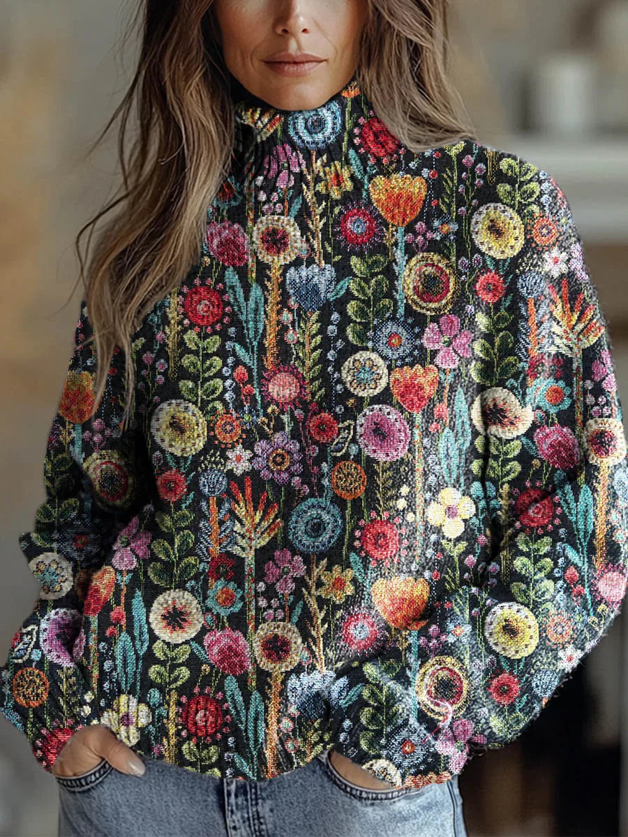 Women's Vintage Floral Art Print Knit Turtleneck Pullover Sweater
